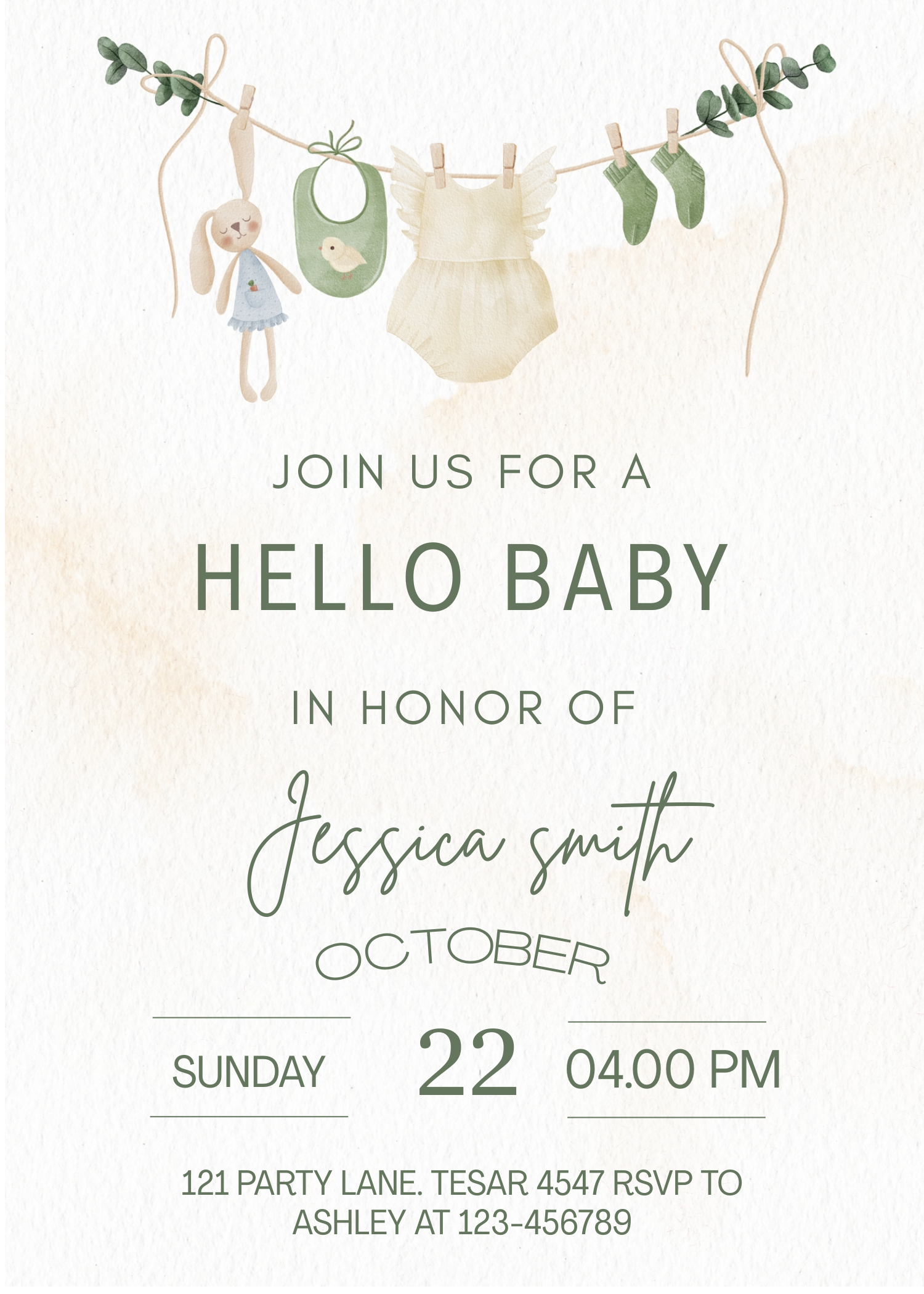 Celebrate the upcoming arrival of your little one with this chic and elegant baby shower invitation! Featuring a soft watercolor texture, neutral tones, and delicate baby clothing on a clothesline, this design is perfect for a classy and modern baby shower.