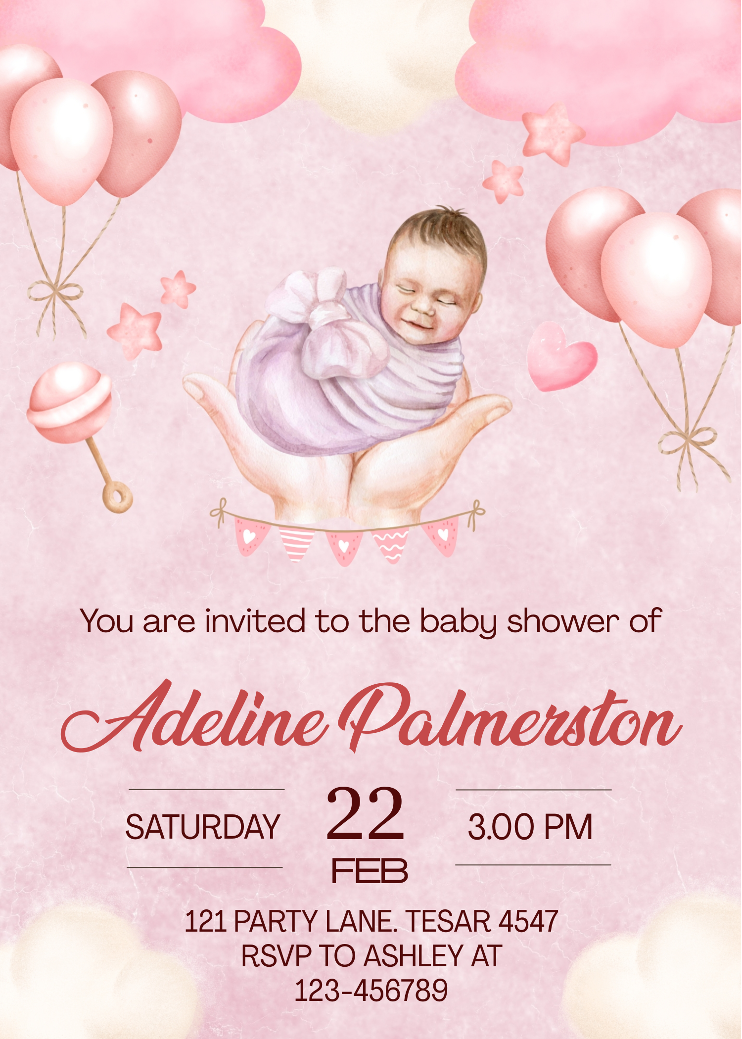 Celebrate your baby’s arrival with this beautifully designed Baby Shower Invitation featuring soft pastel colors, delicate decorations, and a heartwarming illustration of a newborn in loving hands. A perfect choice for an elegant and memorable event! 🎀👶✨