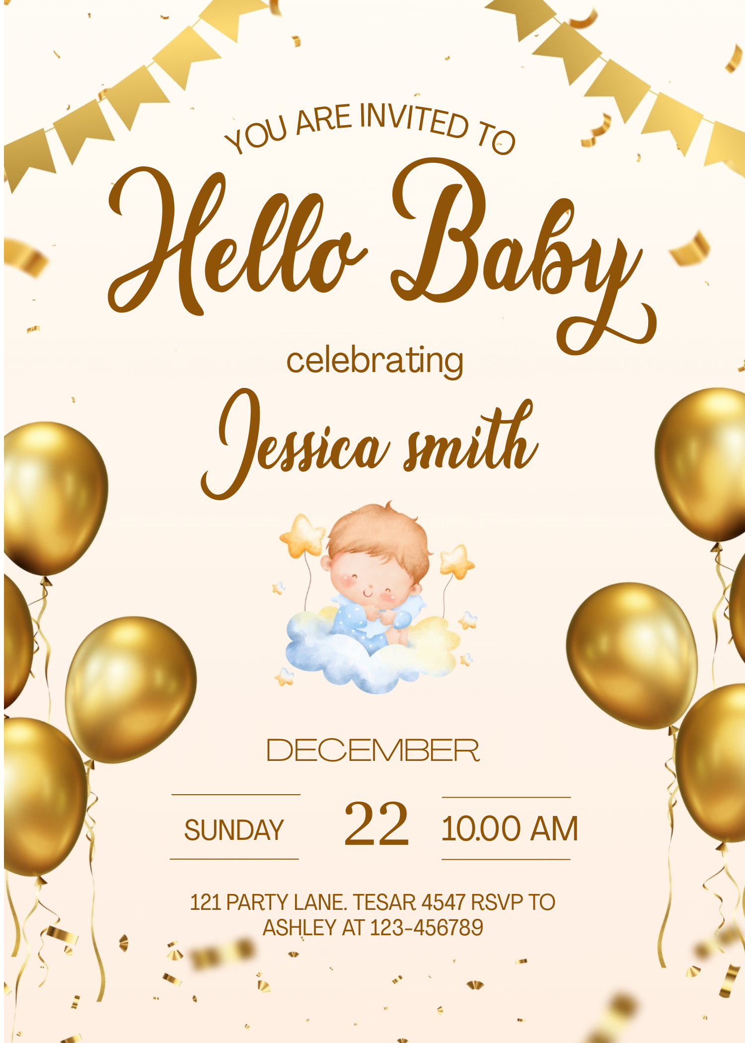 Make your baby shower sparkle with this luxurious gold-themed invitation! Featuring shimmering gold balloons, festive confetti, and a dreamy baby illustration, this invitation adds elegance and charm to your special celebration.